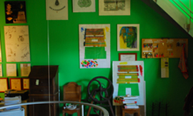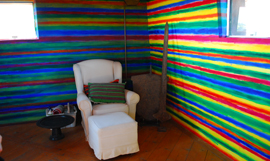 Der Maler Leon Tarasewicz schuf eine überraschende Interpretation von Licht und Landschaft auf den Innenwänden. Waagerecht angeordnet variieren die Zusatzfarben je nach Himmelsrichtung und Sicht aus dem Fenster. Wer nur mit schnellem Blick das Ganze einfängt, wird eine flüchtige grüne Erinnerung haben - und sie schnell vergessen. Wer sich die Zeit nimmt, die Wandlung von Licht und Farben durch die vier Fenster zu erleben, dem erschließt sich ihr abstraktes Abbild.