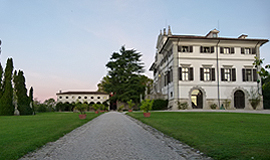 Auf die Frage, wie der Maler Leon Tarasewicz überhaupt auf die Idee kommen konnte, den Innenraum des Weinturms Perusini grün gestreift zu bemalen, bietet sich hier eine Lösung an. Einfach der Natur und ihren Licht- und Schattenspielen zugeschaut und mit den Farben der Tageszeiten ergänzt. Was hier die Schatten wirft, sind die Pappeln auf dem Weg zur Kapelle, den Brautpaare entlang schreiten. Und nach der Trauung zurück. Zu ihrer Feier in der Villa.