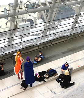 Dabei hat die Leipziger Buchmesse viele Eindrücke hinterlassen. Besonders an den Tagen Donnerstag und Freitag. Da war es noch schön übersichtlich, die Luft kursierte frisch und anregend durch die Glashalle. Einzelne Kostüme lockerten das Jeansblau und Grau der Bekleidung der Besucher auf. Wer als Figur aus einem Buch erschien, hatte freien Eintritt.
