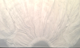 Plissees und Fältelungen kommen immer wieder in den Bildern vor. Hechelmann hat sogar einen riesigen Seidenumhang mit eigener Hand genäht, der in der Ausstellung in einem Schaukasten, von wollweißer Gaze geschützt, ruhte. Was ein Foto dank der mangelnden Ausleuchtung nicht leicht machte. Auch dieses Objekt hatte die Autoren angeregt, Gedanken und Assoziationen nieder zu schreiben.