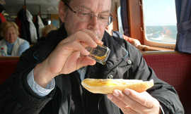 Schon um 10 Uhr bei der Abfahrt standen die ersten Flensflaschen auf dem Tisch vieler Reisender. Der Ruf von Charlie, dem Stewart, "festhalten", folgten alle brav, als sich der Bug hob und wieder ins tiefe Wellental stürzte. Das konnte den Honigträufler in seiner Frühstücksmeditation überhaupt nicht stören. Langsam floss der flüssige Bienenertrag auf das Ciabatta-Brötchen. "Endlich mal groß genug für zwei Honigtöpfchen!" warf er in die Runde.