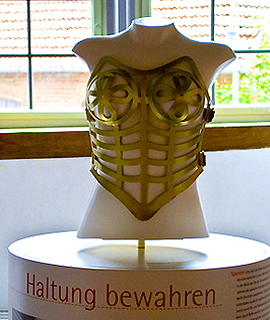 Was tut man sich nicht alles für die Schönheit an! Arme Isabella von Spanien. Dieses Modell aus Metall hat die Frau tagtäglich getragen. Jetzt wissen wir, warum sie stets königlich aufrecht sitzt und steht auf Bildern. Niemals neigte sie huldvoll das Haupt. Wäre das ohne Rippenbrüche möglich gewesen? Ich denke, es half wenig, dass dieses metallne Gerüst mit Samt bezogen war. Und das Gewicht des Monstrums! Man hatte es schon verringert durch diese Form. Wäre es aus massivem Metall gewesen … Für Kulturhistorikerin Kerstin Hopfensitz, die die Konzeption dieser Dauerausstellung entwickelt hat, stellt sich die Frage, ob dieser Nachbau überhaupt korrekt ist. Isabella hatte ein Rückenleiden, deshalb trug sie es. Aber war es nötig, auch die Brüste einzukerkern? Na ja, vielleicht trieben den "Kopisten" von Isabellas Gefängnis Ideen wie Gaultier, der ähnliches für Madonna entwickelte.
