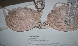 Das Miedermuseum widmet sich dem immer wieder wandelnden Ideal der weiblichen Figur. Allmählich wandte sich nach dem Garconne-Stil mit abgeflachten Busen 1935 der Sinn wieder zur weiblichen Rundung. Dafür brauchte es Füller. Auch heute gibt es sie noch, aber in welch profaner Form! Nix mit Rüschen und Glitzerstoff. Der Slogan zu diesen rosa Träumen lautete: "Wer von Natur aus zu wenig hat, hilft nach". Schlicht, einfach und ohne Schnörkel.