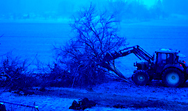 Gestern hat sich was Wesentliches verändert. Die malerischen Apfelbäume vor meinem Gartenzaun, in denen Vögel ihre Tschilporgien abhielten, gibt es nicht mehr. In der blauen Stunde röhrte mit roher Gewalt ein Traktor mit Vorderlader-Schaufel und Schieber rückwärts auf der Wiese und rückte unerbittlich den morschen Stämmen auf die Borke. Mit Wucht knallte die Schaufel auf die Stämme. Gut, nicht immer traf sie den richtigen Winkel, doch der Traktor tanzte wendig, um sein Ziel zu erreichen.