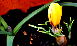 Sieht ziemlich anders aus, dieser Krokus, wie er sich, umspitzt von anderen grünen Fingern, so positioniert. So wie er da steht, der Krokus, könnte er bei flüchtigem Hinsehen auch als gelbrote Tulpe durchgehen. Aber es ist ein Krokus, den ich allerdings noch nie in dieser Farbkombination gesehen habe. Gespannt bin ich auf die grünen Antennen - ich habe die Verpackungen mit der genauen Beschreibung natürlich schon lange ins Altpapier gesteckt.